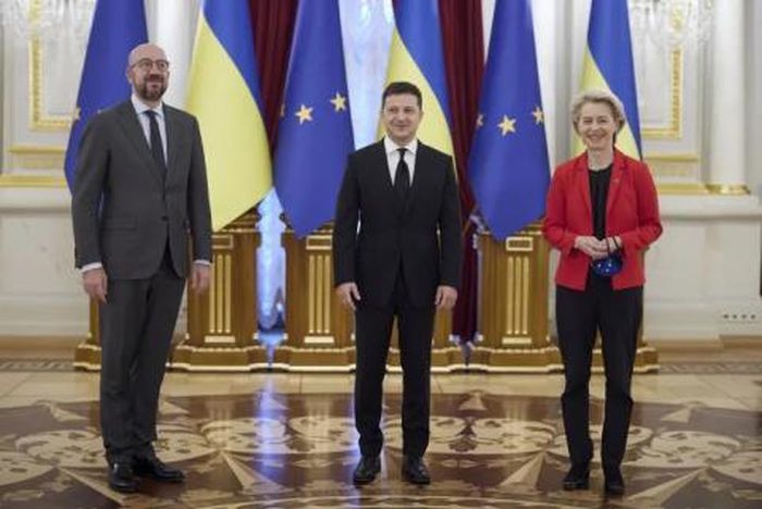Tại cuộc họp báo sau hội đàm, trả lời về triển vọng Ukraine trở thành thành viên EU, Chủ tịch Ủy ban châu Âu von der Leyen nói rằng “chúng tôi là một gia đình châu Âu và chúng tôi đang làm việc cùng nhau”.