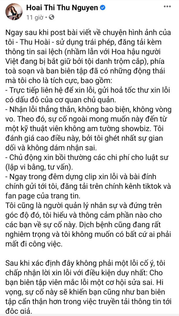 Đồng thời, nàng Hậu cũng cho biết sẽ chấp nhận lời xin lỗi với điều kiện duy nhất: "Cho bạn biên tập viên mắc lỗi một cơ hội sửa sai. Hi vọng, sự cố này sẽ khiến bạn cũng như ban biên tập cẩn thận hơn trong việc truyền tải thông tin tới độc giả".