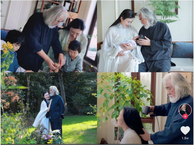 Ngoài ra, Trương Kỷ Trung cũng từng gửi lời nhắn dành cho cô vợ kém 31 tuổi - Đỗ Tinh Lâm: "Có em, có gia đình, anh hạnh phúc tràn đầy. Chúc mọi người 520 vui vẻ". Nam đạo diễn vui mừng vì ở tuổi U70 gần đất xa trời vẫn có con bế ngửa. Hình ảnh người đàn ông râu tóc bạc trắng ẵm con bế ngửa từng gây sốt trên mạng.