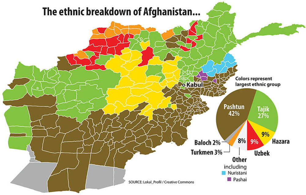Các tỉnh Daykundi và Wardak nằm phía đông và nam khu vực màu vàng tập trung người dân tộc Hazara ở miền trung Afghanistan.