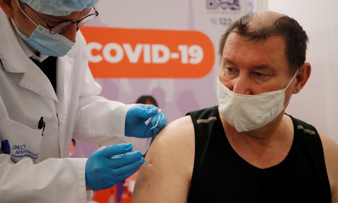 Nhân viên y tế tiêm vaccine Covid-19 cho người đàn ông ở St. Petersburg, Nga, ngày 24/2. Ảnh: Reuters.