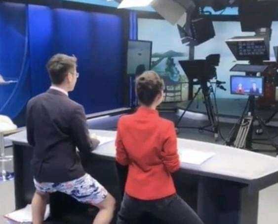 Hình ảnh này được chụp ở nước ngoài, trong đó nam MC đang dẫn nhưng quần chỉ là quần đùi. Điều này gây bất ngờ với khán giả và cư dân mạng. Bởi ai cũng tưởng tượng rằng khi MC lên sóng dù không lấy hình ở phần chân song vẫn mặc quần dài đầy đủ.Không biết trong trường hợp này, MC nam bị cư dân mạng photoshop hay là mặc quần đùi thật lên sóng truyền hình. Song bức ảnh cũng góp phần cho khán giả hiểu được phần nào về trường quay của một bản tin trông như thế nào. Bởi thông thường rất hiếm khi khán giả được chứng kiến thật sự bên trong trường quay có gì.