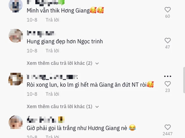 Điển hình như mới đây, đoạn clip "team qua đường" bắt trọn Hương Giang và Ngọc Trinh đọ sắc tại sự kiện tiếp tục gây sốt trên mạng xã hội TikTok, khi visual thế nào mà bị đàn em "chặt đẹp" luôn, sau khi Ngọc Trinh bị netizen nhận xét kém sắc hơn hẳn Hương Giang khi cùng đọ sắc trên thảm đỏ.