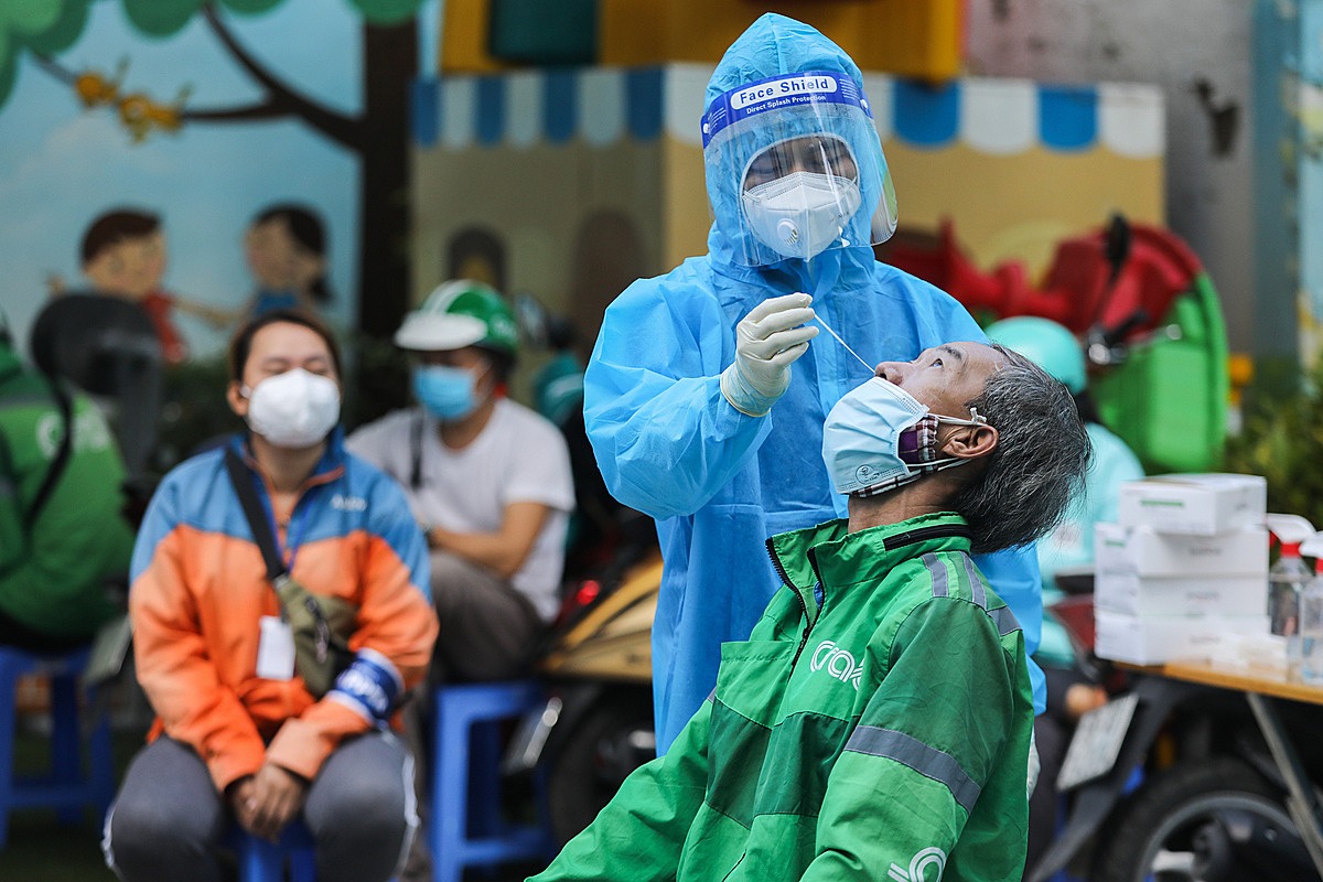 Shipper xếp hàng chờ xét nghiệm ở quận Gò Vấp, ngày 20/9/2021. Ảnh: Quỳnh Trần