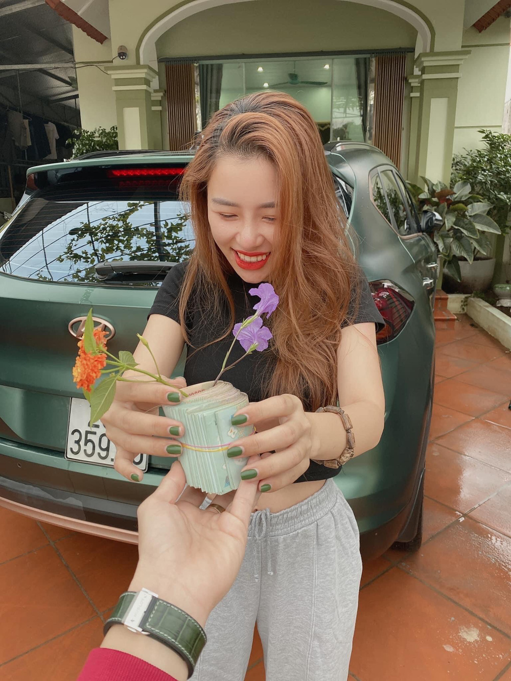 Theo đó, chồng Thái Hà quả thực đã hái hai nhành hoa dại tặng vợ. Nhưng phần đặc sắc nhất của món quà chính là ở phần "chậu hoa". Anh chồng này đã nhanh trí dùng một cọc tiền polymer cuộn lại làm thành "chậu hoa", rồi cắm hai nhành hoa vào đem tặng vợ.