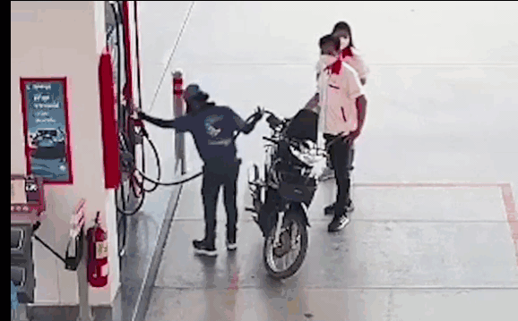 Một con rắn hổ mang đã trườn khỏi động cơ của chiếc xe máy rồi rơi xuống đất. Ngay sau đó, nó bò về phía nữ nhân viên đang đứng bơm xăng. Chỉ đến khi dẫm phải con rắn, nữ nhân viên mới hoảng hốt, lập tức nhảy ra xa.