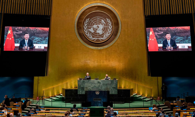 Bài phát biểu ghi hình sẵn của Chủ tịch Tập Cận Bình được phát tại Đại hội đồng Liên Hợp Quốc ở New York, Mỹ hôm 22/9. Ảnh: AFP.