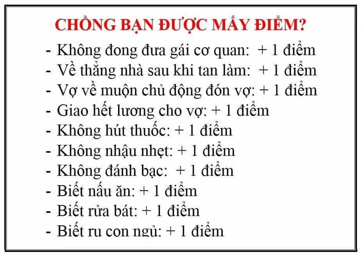 Nhân ngày Phụ Nữ Việt Nam 20/10, ở Việt Nam chúng ta có phong trào chấm điểm chồng. Đại loại là ông chồng nào mà hội tụ đủ 10 tiêu chí gồm: không đong đưa gái cơ quan, về thẳng nhà sau khi tan làm, vợ về muộn chủ động đón vợ, giao hết lương cho vợ, không hút thuốc, không nhậu nhẹt, không đánh bạc, biết nấu ăn, biết rửa bát, biết ru con ngủ thì ông chồng đó được 10 điểm. Cả cơ quan gần trăm ông, có duy nhất mỗi mình tôi đạt 10 điểm tuyệt đối, còn mấy ông khác toàn lẹt đẹt dưới trung bình, riêng sếp tôi còn bị điểm liệt. Nhưng nói thật, thành tích ấy có được không phải do sự cố gắng hay là năng lực thực sự của bản thân tôi, mà hoàn toàn nhờ vào sự giúp đỡ và hi sinh cao cả của vợ...