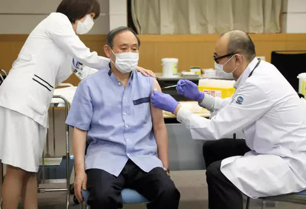 Cựu Thủ tướng Nhật Bản Yoshihide Suga tiêm vắc-xin Covid-19 vào ngày 16-3. Ảnh: Reuters