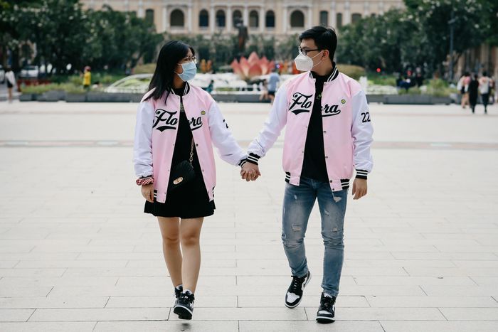 Quỳnh Như và Phúc Khang (18 tuổi) chọn trang phục đôi khi dạo phố. Đôi bạn yêu thích những bộ đồ có phom dáng thoải mái, năng động. Đây là một trong những yếu tố khiến Quỳnh Như và Phúc Khang chọn áo khoác bóng chày là đồ đôi.