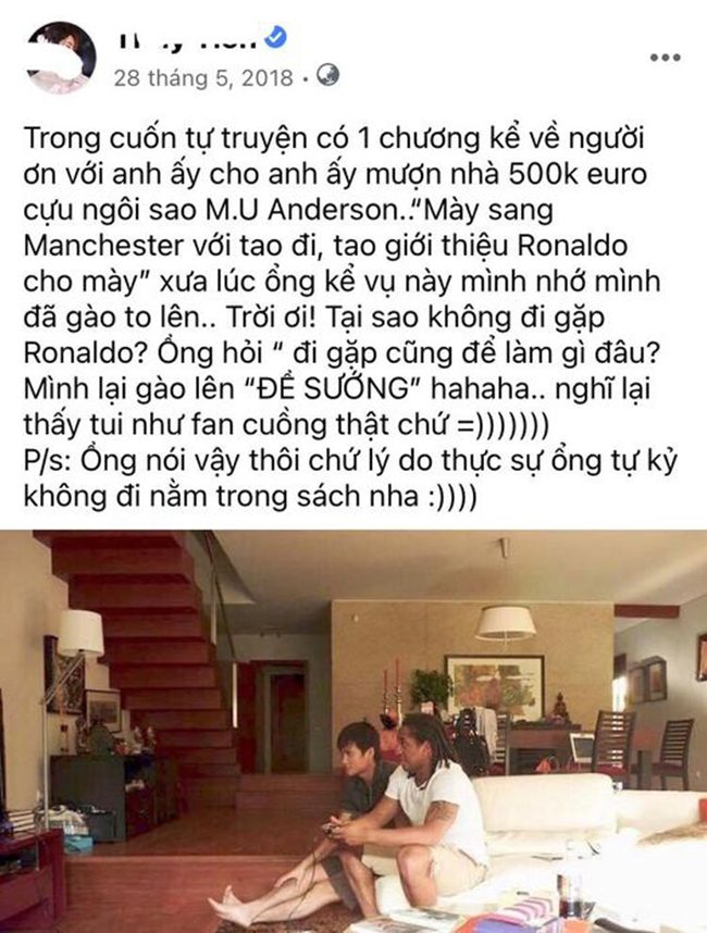 Vào năm 2018, Thủy Tiên từng đăng trên trang cá nhân dòng trạng thái: ” Trong cuốn tự truyện có 1 chương kể về người ơn với anh ấy cho anh ấy mượn nhà 500K euro cựu ngôi sao Manchester United (MU) “Mày sang Manchester với tao đi, tao giới thiệu Ronaldo cho mày”.