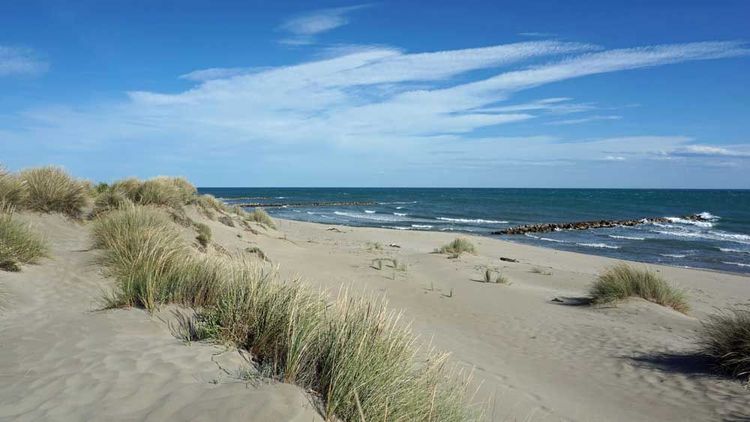 Bờ biển lộng gió của vùng Languedoc dường như kéo dài vô tận khi trải dài từ Camargue đến bờ biển Tây Ban Nha. Ngay cả trong cao điểm mùa hè, bãi biển này cũng có cực ít du khách biết đến. Ở rìa phía tây của Camargue là Plage de l’Espiguette, có gần 10 km các đụn cát chưa được khai thác. Nếu bạn muốn tìm các quán bar trên bãi biển có thể đến Le Grau du Roi hoặc La Grande Motte.