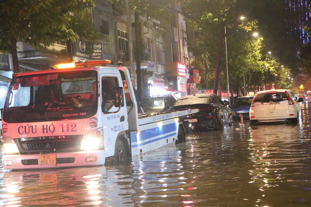 Xe cứu hộ di chuyển phương tiện khỏi khu vực bị ngập tại quận 1, TP.HCM trong những cơn mưa gần đây