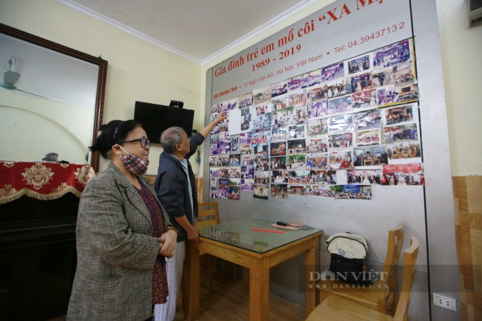 Vợ chồng ông Tiến bên những tấm ảnh lưu niệm tại gia đình trẻ em mồ côi "Xa mẹ". Ảnh: Gia Khiêm