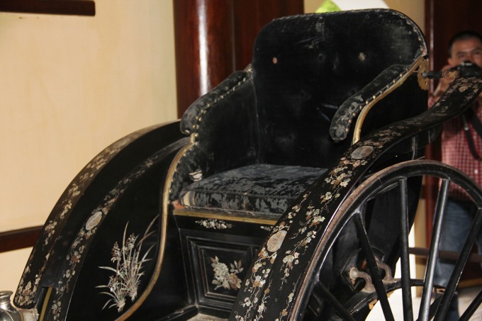 Ông Phan Thanh Hải, Giám đốc Trung tâm Bảo tồn di tích cố đô Huế lúc đó cho biết xe kéo này ngoài giá trị về mỹ thuật thuộc hàng đẹp nhất Việt Nam, được khảm xà cừ tinh xảo do nhóm nghệ nhân làng nghề nổi tiếng miền Bắc thực hiện, còn có tính lịch sử cao khi phản ánh một giai đoạn của triều đại phong kiến cuối cùng ở Việt Nam. Ảnh: Đắc Đức