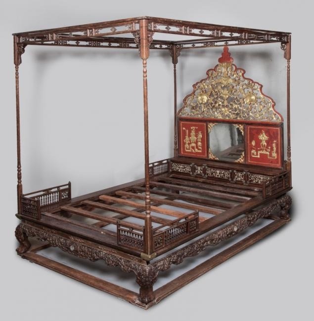 Cũng trong phiên đấu giá trên, long sàng của vua Thành Thái được đấu giá với mức ba tỷ đồng, thuộc về một Việt kiều là cháu ngoại vua Thành Thái. Long sàng làm bằng gỗ, các hoa văn ở vị trí thành, chân và khung giường được chạm trổ theo mô-típ cung đình Huế. Phần đầu gường ở trên chạm trổ, thếp vàng hoa lá hóa dơi theo mô-tip ngũ phúc; phần đầu hộc giường phía sau chạm trổ, sơn son thếp vàng hoa văn tam sơn, cổ đồ và rồng ngang bốn móng; phần đầu hộc giường phía trước chạm trổ con triện và mô-tip chữ tọ hình đỉnh cách điệu. Phần thân và chân giường chạm trổ hoa lá, rồng mây dưới dạng dao hóa không sơn thếp. Ảnh: Rouillac