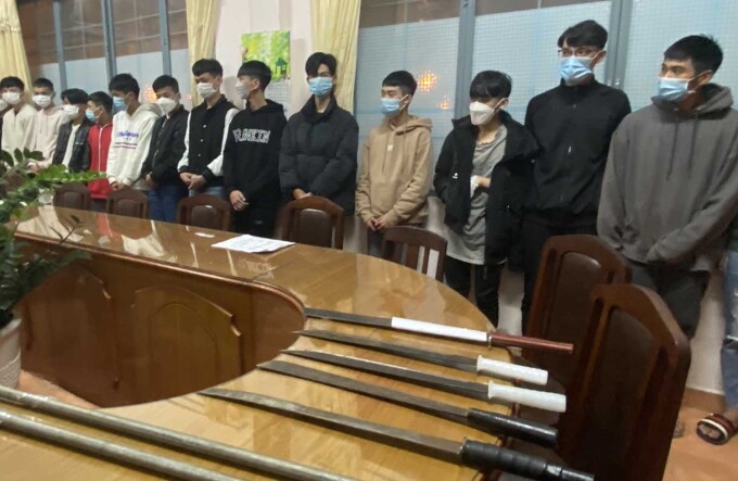 Nhóm thanh thiếu niên bị mời lên làm việc, cùng hung khí gây án. Ảnh: Khánh Hương