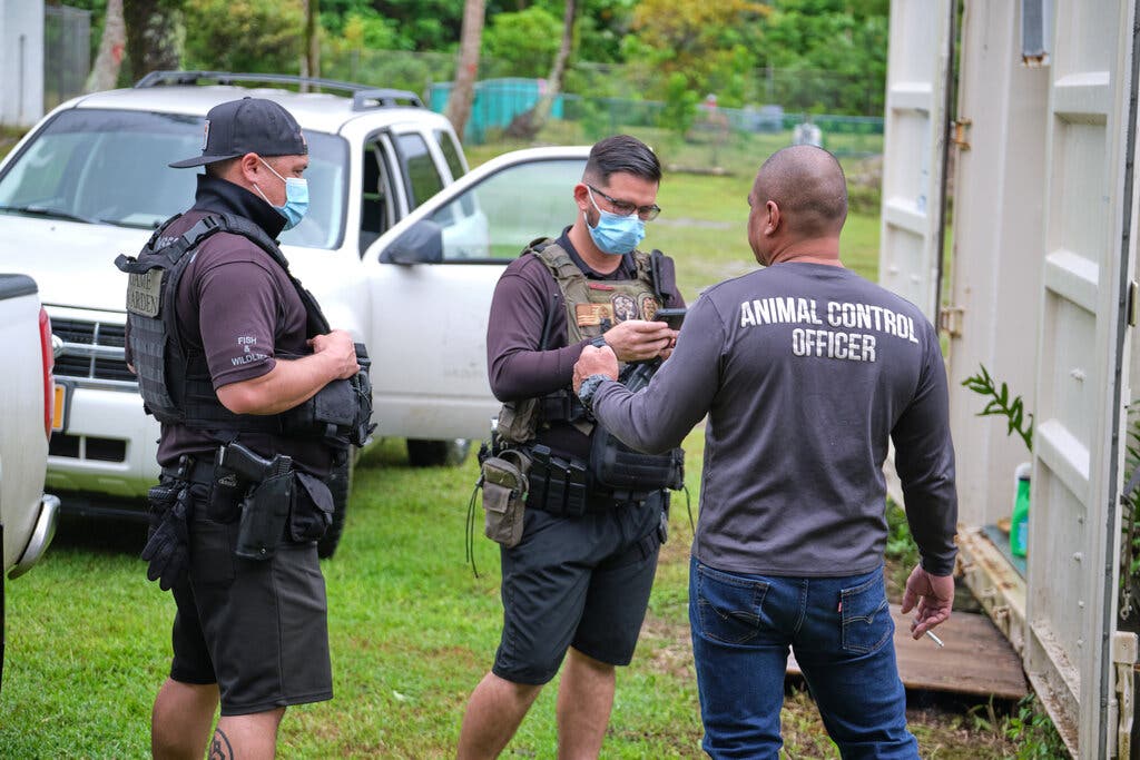 Ông Nicholas Ibanez (phải), nói chuyện với các nhân viên bảo tồn ở Yigo, đảo Guam. Ảnh: NYTimes
