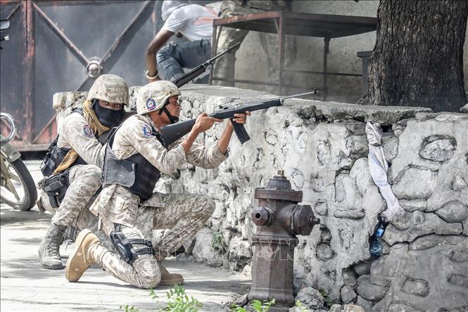 Lực lượng an ninh Haiti xung đột với các tay súng bên ngoài đồn cảnh sát ở Port-au-Prince. Ảnh tư liệu: AFP/TTXVN