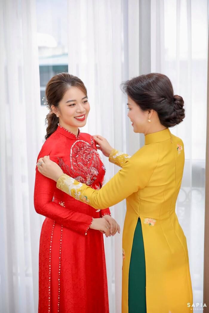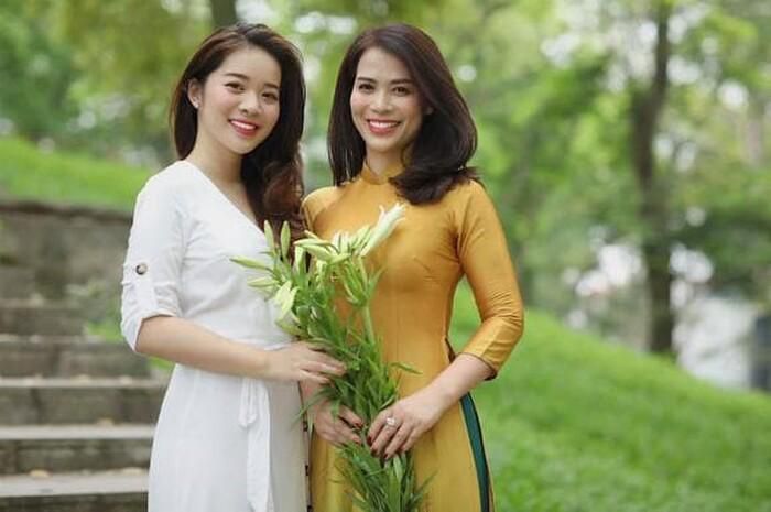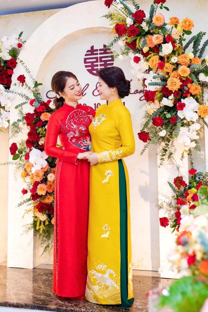 Trong ngày lên chức mẹ vợ, doanh nhân Ý Lan mặc áo dài màu vàng, trong khi Khánh Linh diện áo dài đỏ nổi bật. Nhờ sở hữu vẻ ngoài trẻ trung, xinh đẹp nên trông bạn gái của nghệ sĩ Chí Trung và con gái của cô không khác hai chị em là bao.
