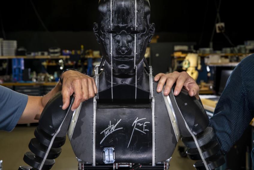 Trên phần ngực của nguyên mẫu Mk1 là chữ ký của nam diễn viên Tom Holland (trái), người đang thủ vai Spider-Man của MCU; và Kevin Feige, chủ tịch hiện tại của Marvel Studios, bộ não sáng tạo phía sau loạt phim MCU trong hơn 1 thập kỷ qua.
