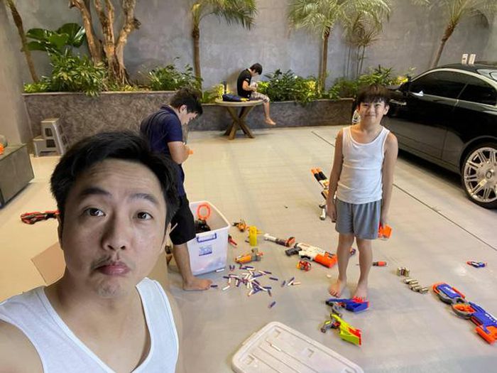 Cường Đô La cũng thường xuyên đồng hành cùng con trong các hoạt động thể chất như chạy bộ, bơi lội, trượt patin, chèo thuyền kayak, chơi bắn súng...Ảnh: FBNV