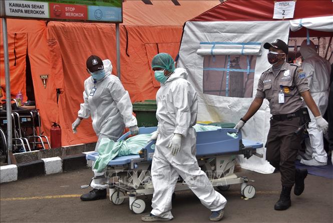 Nhân viên y tế chuyển bệnh nhân tử vong do COVID-19 tại bệnh viện ở Bekasi, Indonesia, ngày 1/7/2021. Ảnh: AFP/TTXVN