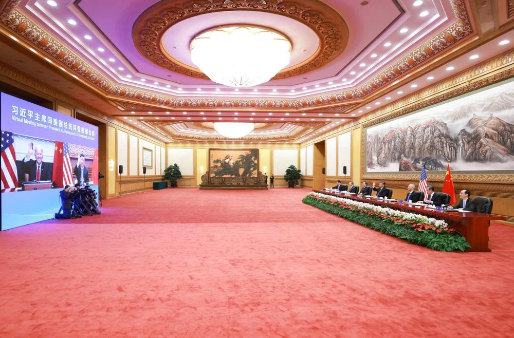 Đây là cuộc gặp đầu tiên giữa lănh đạo hai nước Mỹ, Trung Quốc kể từ khi ông Biden nhậm chức. Ảnh: Xinhua/Ding Lin