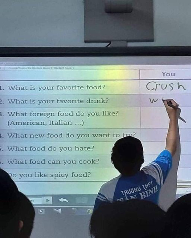 Theo đó, trong một tiết học Tiếng Anh ở một lớp cấp 3, giáo viên yêu cầu học sinh lên bảng làm bài tập trả lời các câu hỏi. Nội dung từ trên xuống dưới của loạt câu hỏi này đều liên quan đến ăn uống, trong đó câu hỏi đầu tiên hỏi về món ăn mà học sinh yêu thích. Chẳng phải món ăn truyền thống phở, hủ tiếu, bánh xèo, bún đậu, cũng chẳng phải món Tây nào như pizza, gà rán, học sinh viết tên một món mà ai cũng phì cười: Crush!