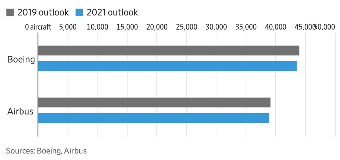 Dự báo sản lượng máy bay mới trong 20 năm tới, trong đó, màu xám là dự báo đưa ra năm 2019 và màu xanh là dự báo đưa ra năm 2021. Đồ họa: WSJ