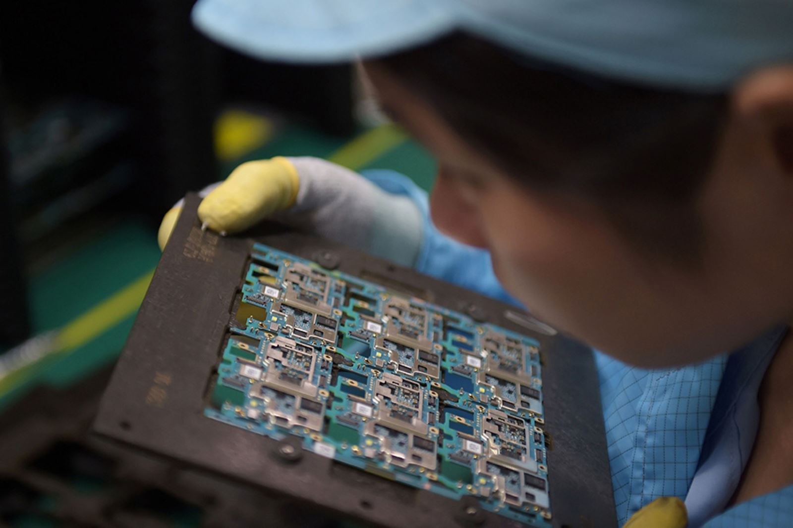 Công nhân kiểm tra linh kiện chip điện thoại thông minh tại một nhà máy ở Đông Quản, Quảng Đông, Trung Quốc. Ảnh: AFP/Getty Images