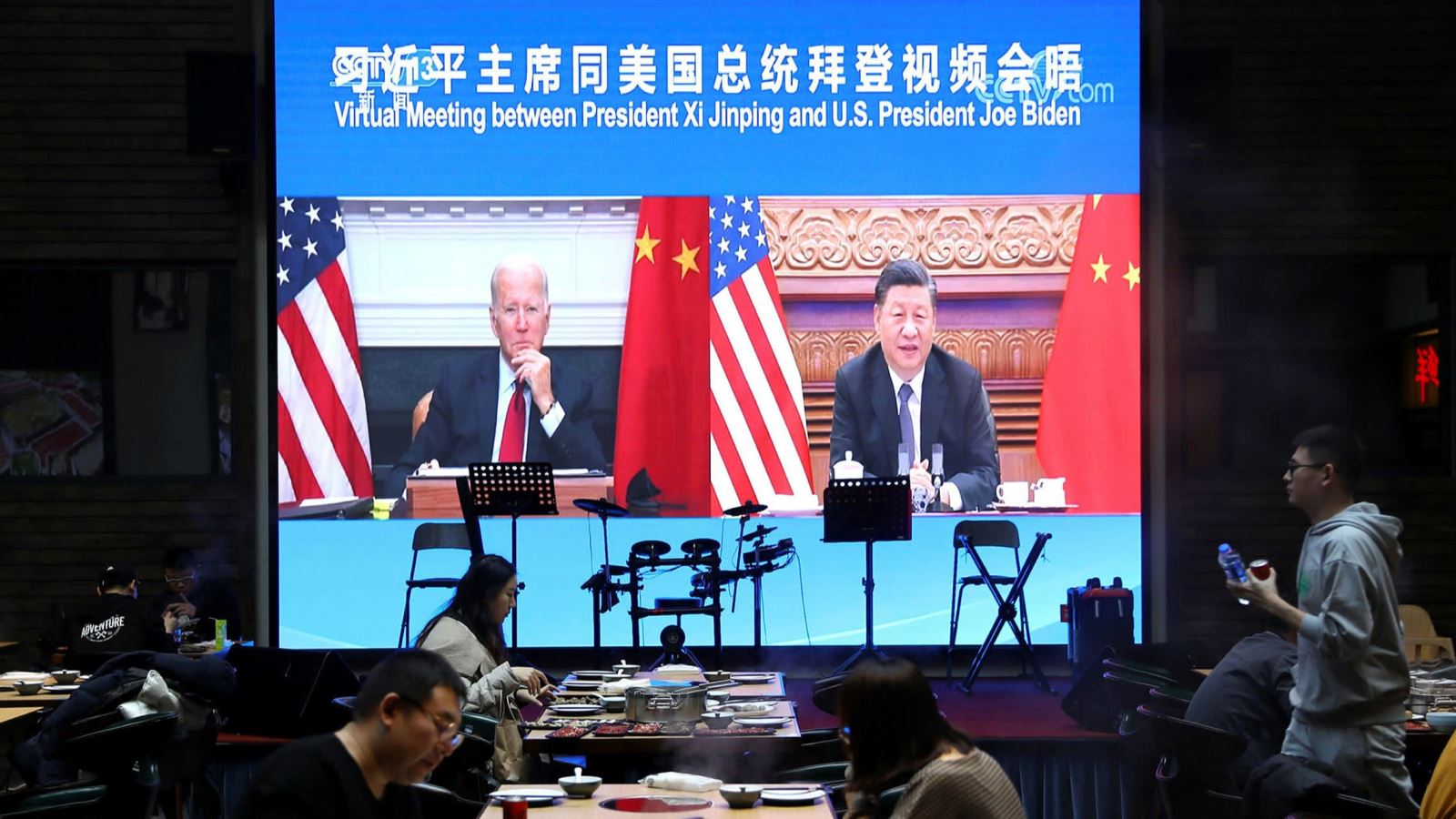 Người Trung Quốc dùng bữa tại nhà hàng có màn hình lớn đưa tin về cuộc gặp trực tuyến đầu tiên giữa Tổng thống Mỹ Joe Biden và Chủ tịch Tập Cận Bình. Ảnh: FT