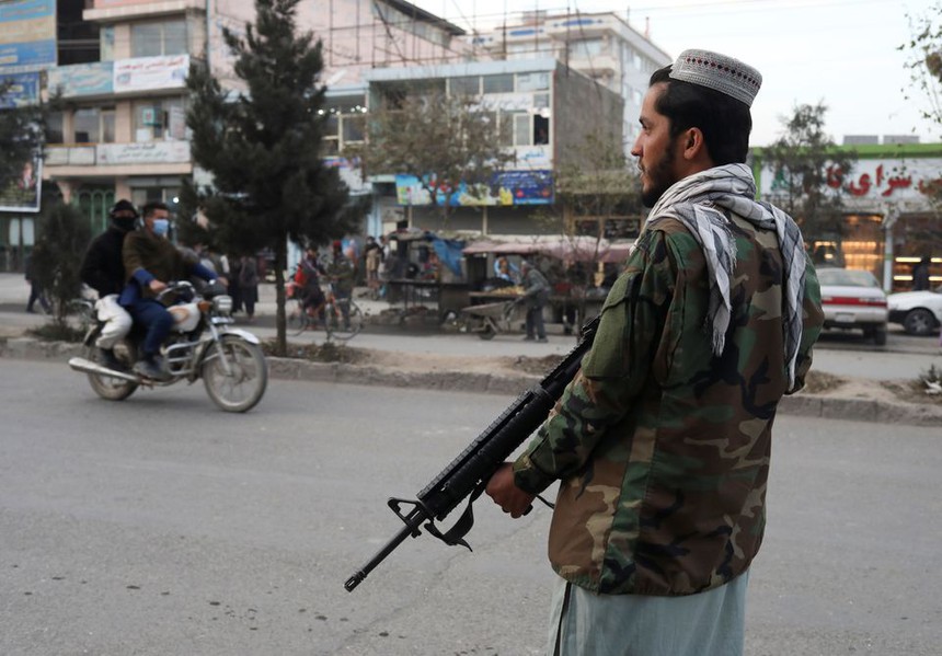 Một chiến binh Taliban đứng gác tại địa điểm xảy ra vụ nổ ở Kabul, Afghanistan, ngày 17/11. Ảnh: Reuters.