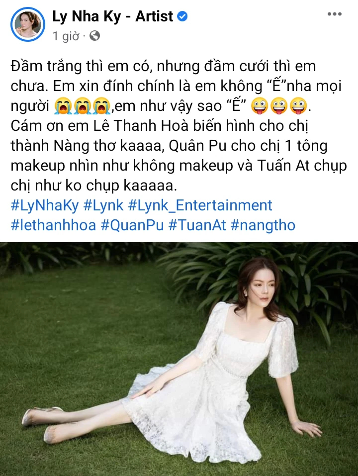 Mới đây, Lý Nhã Kỳ tiếp tục chiêu đãi người hâm mộ bằng hình ảnh khoe vẻ đẹp kiêu sa, mặn mà trên trang cá nhân. Chọn cho mình trang phục sang trọng, Lý Nhã Kỳ khoe dáng thon gọn, nuột nà. Bên cạnh đó, làn da căng mịn, trắng nõn nà của cô khiến nhiều chị em phải mơ ước. Nữ diễn viên phim Kiều Nữ Và Đại Gia không quên đính chính lại sự "ế" của bản thân: "Đầm trắng thì em có nhưng đầm cưới thì em chưa. Em xin đính chính là em không ế nha mọi người, em như vậy sao ế".