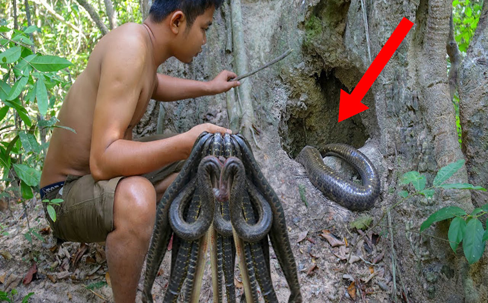 Một người đàn ông khi sinh tồn trong rừng đã phát hiện ra rất nhiều con rắn đang bò trên đường. Anh ta liền sử dụng một cây gỗ dài để đánh mạnh vào đầu chúng. Sau đó, anh lần theo dấu vết của chúng và phát hiện ra một hốc cây to.