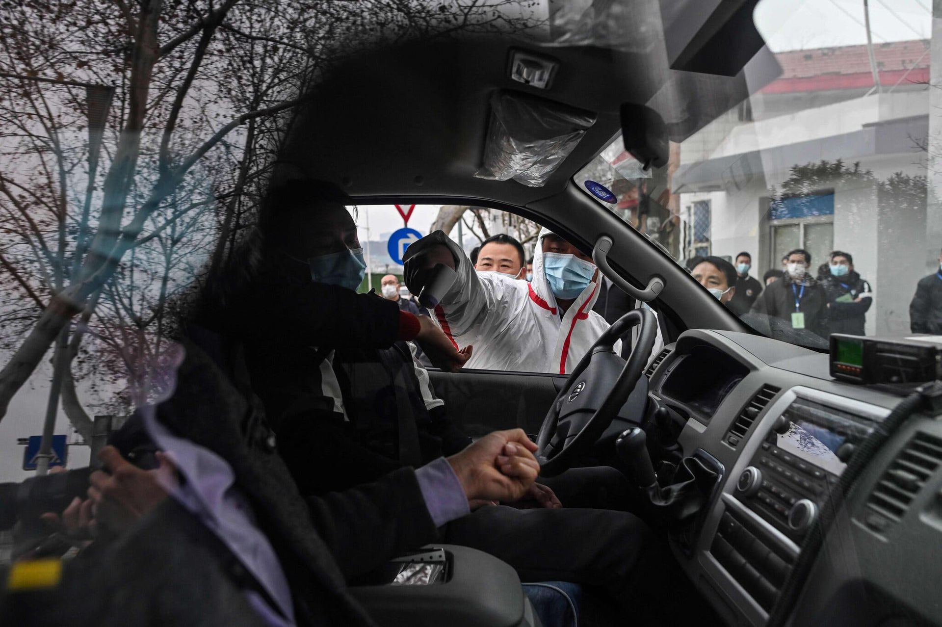 Các thành viên của đội điều tra từ WHO tại điểm kiểm tra thân nhiệt tại Vũ Hán vào tháng 2. Ảnh: AFP.
