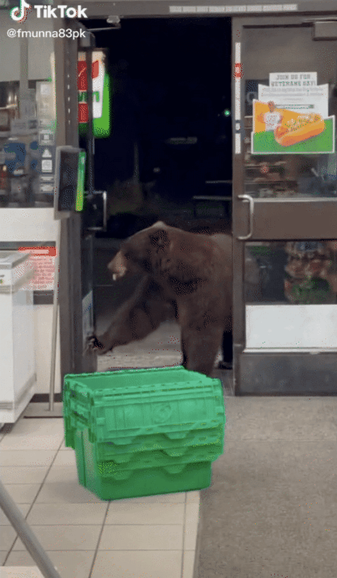 Trong video, có thể thấy một con gấu xám khá to từ đâu tiến vào bên trong cửa hàng. Dù cửa đã đóng nhưng nó vẫn có thể tự đứng dậy mở ra với ý định tiến vào bên trong, chắc là để "vớ" vài món đồ ăn lót dạ.