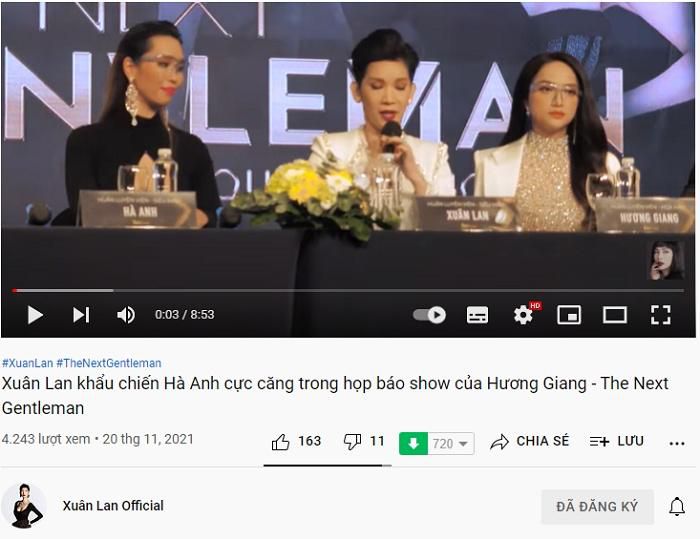 Sau đó, trên trang YouTube của siêu mẫu Xuân Lan đăng tải lại đoạn video này với tiêu đề: “Xuân Lan khẩu chiến Hà Anh cực căng trong họp báo show của Hương Giang”. Điều này không ít ý kiến nghi ngờ, đây là drama có chủ ý để thu hút sự quan tâm.