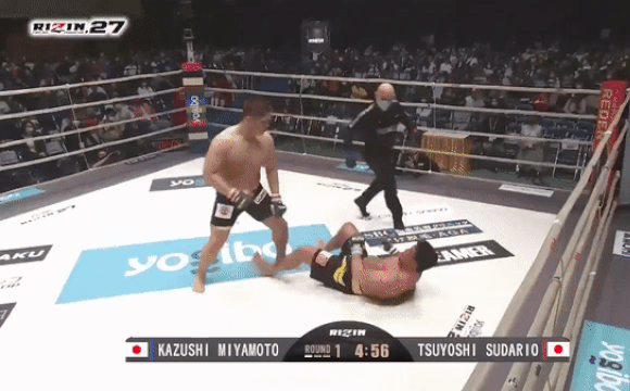 Đây là trận so tài giữa 2 võ sĩ Tsuyoshi Sudario và đối thủ Kazushi Miyamoto diễn ra vào ngày 21/3/2020 tại Nagoya, Nhật Bản trong khuôn khổ sự kiện Rizin FF 27. Tsuyoshi Sudario vốn được biết đến, thậm chí khá nổi tiếng khi còn là võ sĩ sumo, anh cũng từng một lần giành chức vô địch Nhật Bản. Nhưng đến năm 2020, võ sĩ 23 tuổi này mới quyết định chuyển sang đấu võ MMA, anh đã liên tục có 2 chiến thắng knock-out trước Dylan James, Ikuhisa Minowa vào cuối năm 2019.