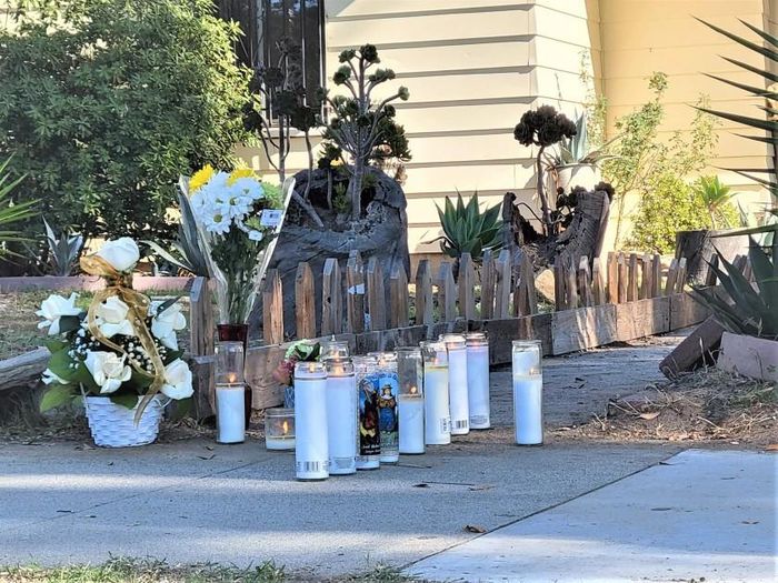 Góc tưởng niệm nạn nhân bên ngoài ngôi nhà ở thành phố Pasadena, California, Mỹ. Ảnh: Los Angeles Times.