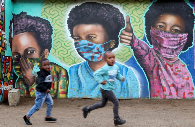 Các em nhỏ vui chơi gần bức họa vẽ trẻ em đeo khẩu trang tại Kliptown, Nam Phi hồi tháng 10/2021 (Ảnh: Reuters).