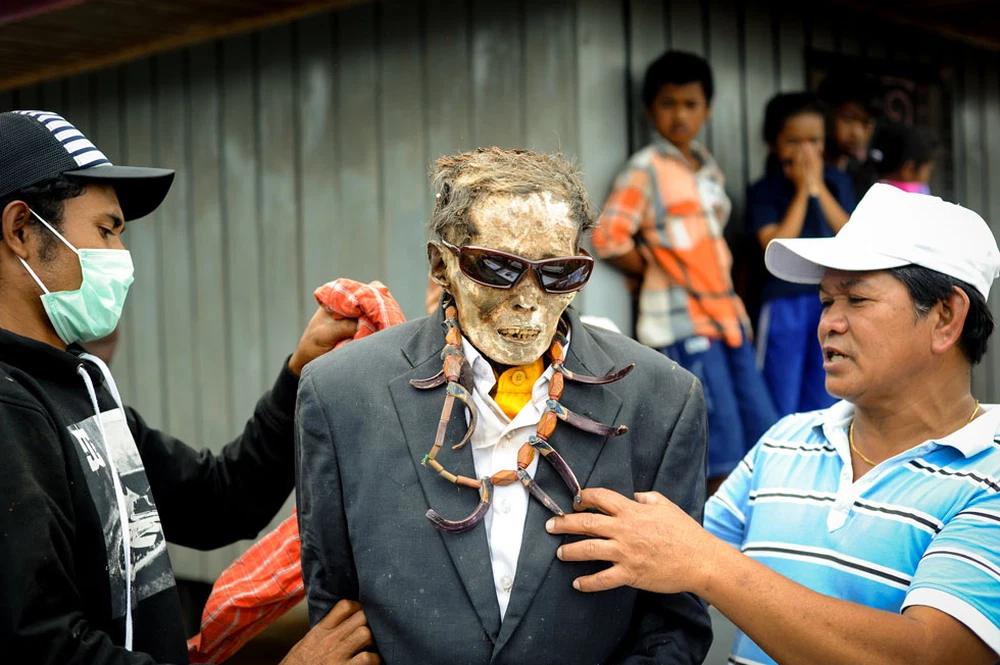 Theo như cứ vài năm một lần ở Tana Toraja, Indonesia, thì nhiều người dân lại đào thi thể người thân đã khuất của mình lên, trang điểm và mặc quần áo đẹp để cả nhà cùng chụp ảnh trên đỉnh núi ở làng Pangala, phía Bắc Toraja người ta tổ chức một nghi lễ có tên là ma'nene để bày tỏ lòng kính trọng đối với tổ tiên của người dân ở đây.