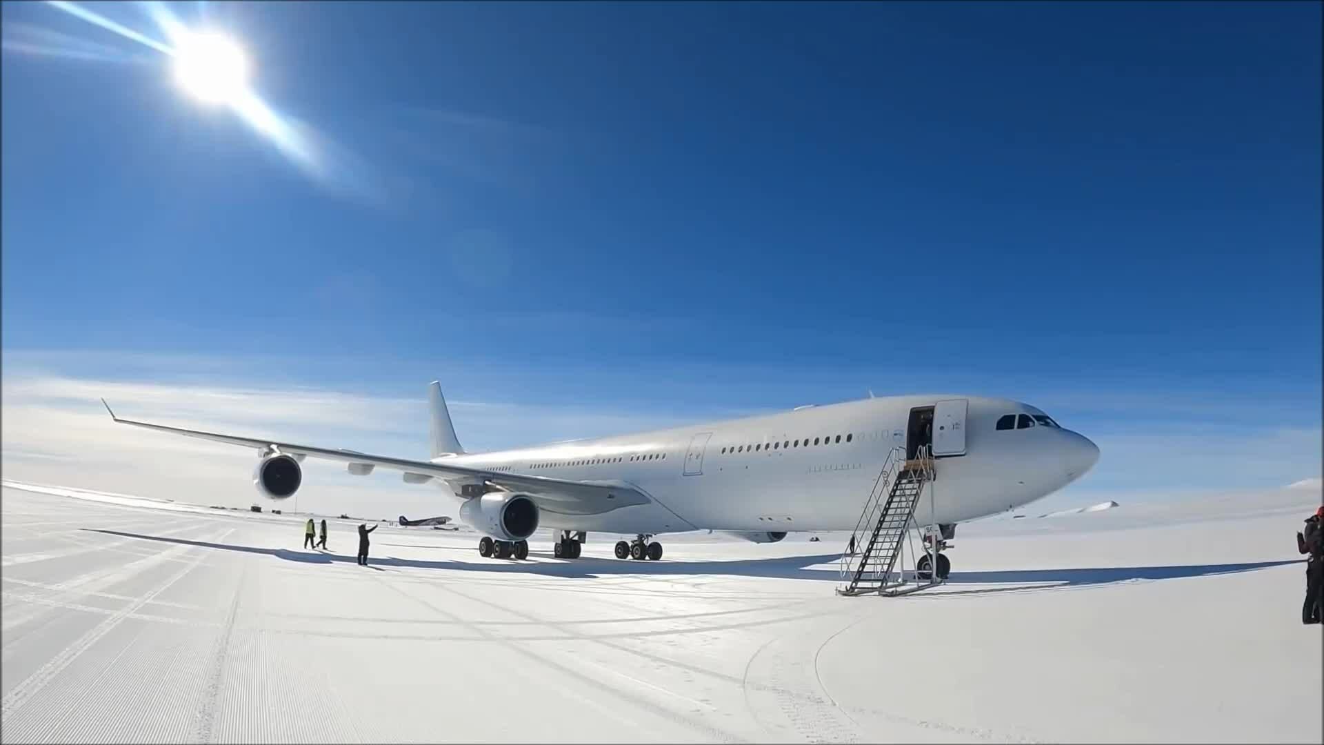 Máy bay Airbus A340 hạ cánh trên đường băng với những rãnh đặc biệt để tăng ma sát, hoàn thành nhiệm vụ chở người và hàng cho trại thám hiểm.