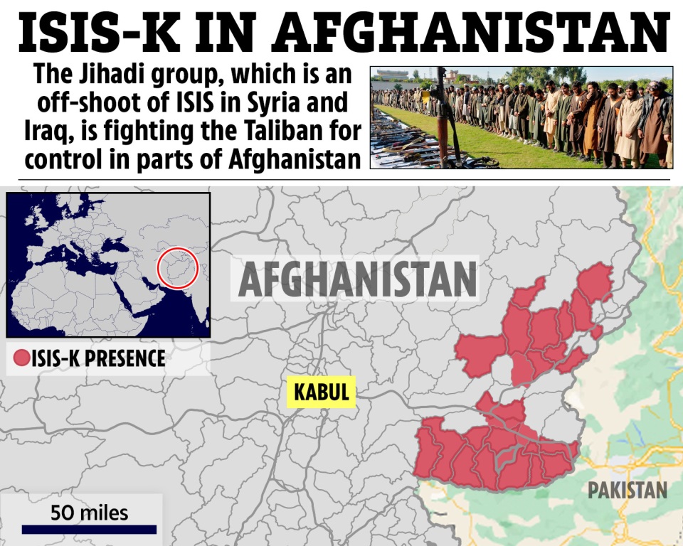 Một đồ họa của The Sun cho thấy khu vực hoạt động mạnh của IS-K ở đông nam Afghanistan.