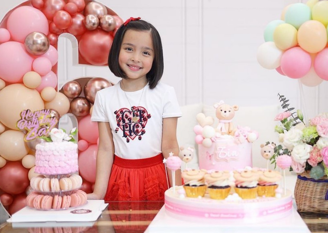 Bé Zia đón sinh nhật lần thứ sáu bốn ngày trước. Trên trang cá nhân, người đẹp Marian Rivera đăng ảnh con chụp ảnh bên bánh kem với đầm xanh của hãng Carolina Herrera, nhấn vào đường viền đen ở cổ, tay và thắt nơ eo.