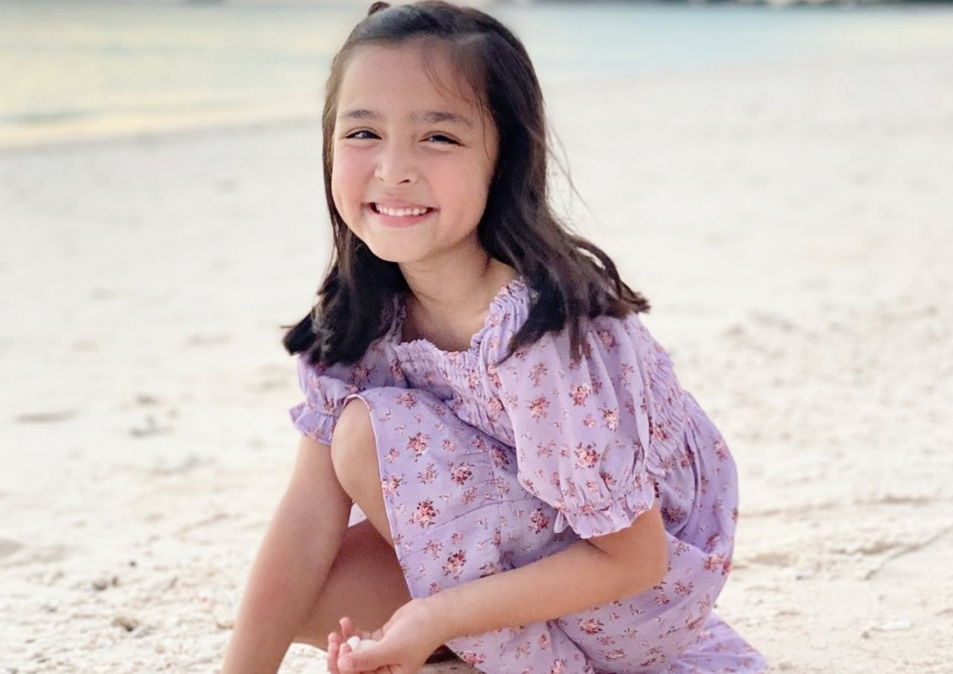 Cuối tháng 10, vợ chồng Marian Rivera đưa con đến vùng biển gần thủ đô Manila, Philippines nghỉ dưỡng. Zia ghi điểm với đầm họa tiết hoa gam tím chủ đạo, cười rạng rỡ trước ống kính của mẹ.