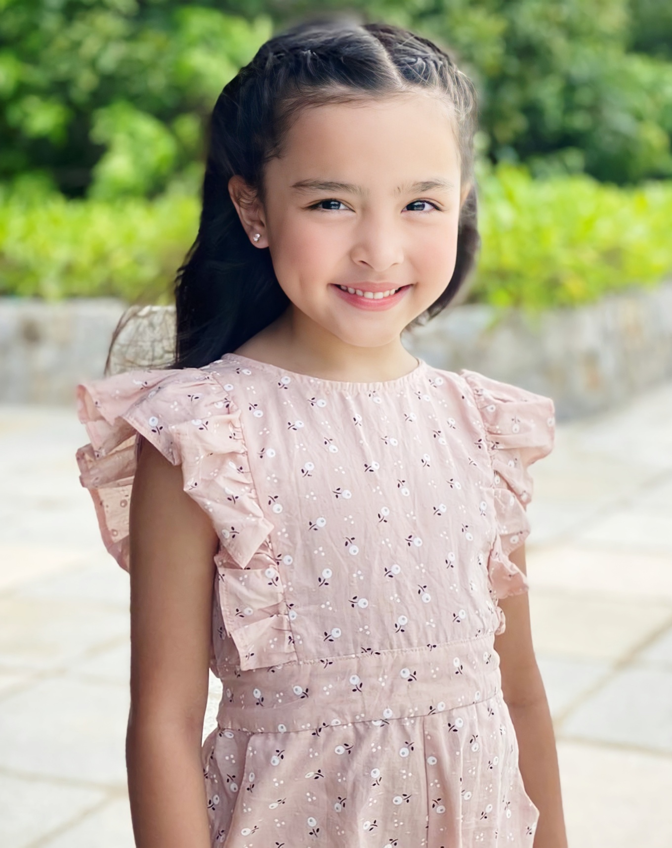 Cô bé diện đầm trễ vai chấm bi chụp ảnh cùng bố mẹ. Tài tử Dingdong Dantes (sinh năm 1980) và Marian Rivera (1984) - nhiều lần thắng bình chọn "Mỹ nhân đẹp nhất Philippines" - bén duyên sau các lần hợp tác trong dự án "Vũ điệu hoang dã", "Chuyện tình nàng tiên cá", "Chân trời có em"... Họ kết hôn tháng 12/2014, sinh con gái đầu lòng năm 2015 và con trai chào đời 2019.