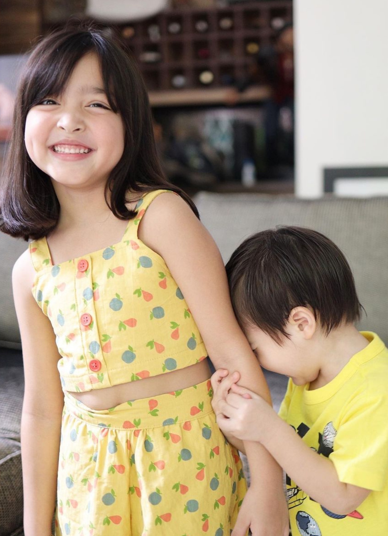 Sao nhí chọn set đồ họa tiết trái cây trong dịp sinh nhật bố - tài tử Dingdong Dantes - tròn 41 tuổi hồi đầu tháng 8. Vì dịch, minh tinh Marian Rivera tự vào bếp, cùng con gái thổi bóng, trang trí không gian tiệc đơn giản tại nhà và chỉ mời vài người thân đến chung vui.