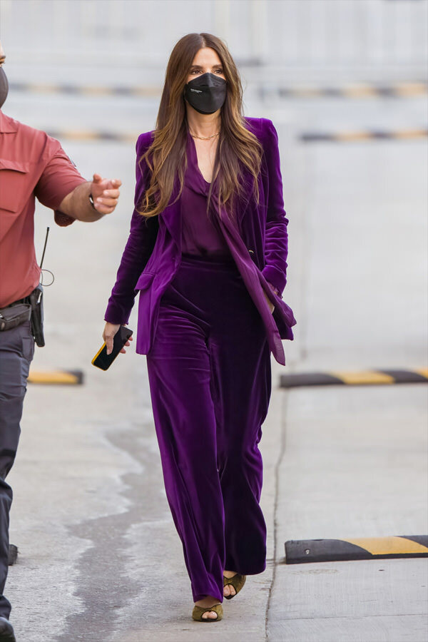 Diễn viên Sandra Bullock lăng xê suit nhung của Temperley London, kết hợp ăn ý với giày cao gót màu nâu nhạt. Ảnh: Tom + Lorenzo