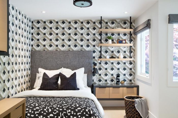 Phòng dành cho con trai trở nên bắt mắt hơn với giấy dán tường độc đáo.“Vì bức tường khó xử và có góc cạnh, nên chúng tôi phải sáng tạo với cách bài trí", Amanda cho biết.